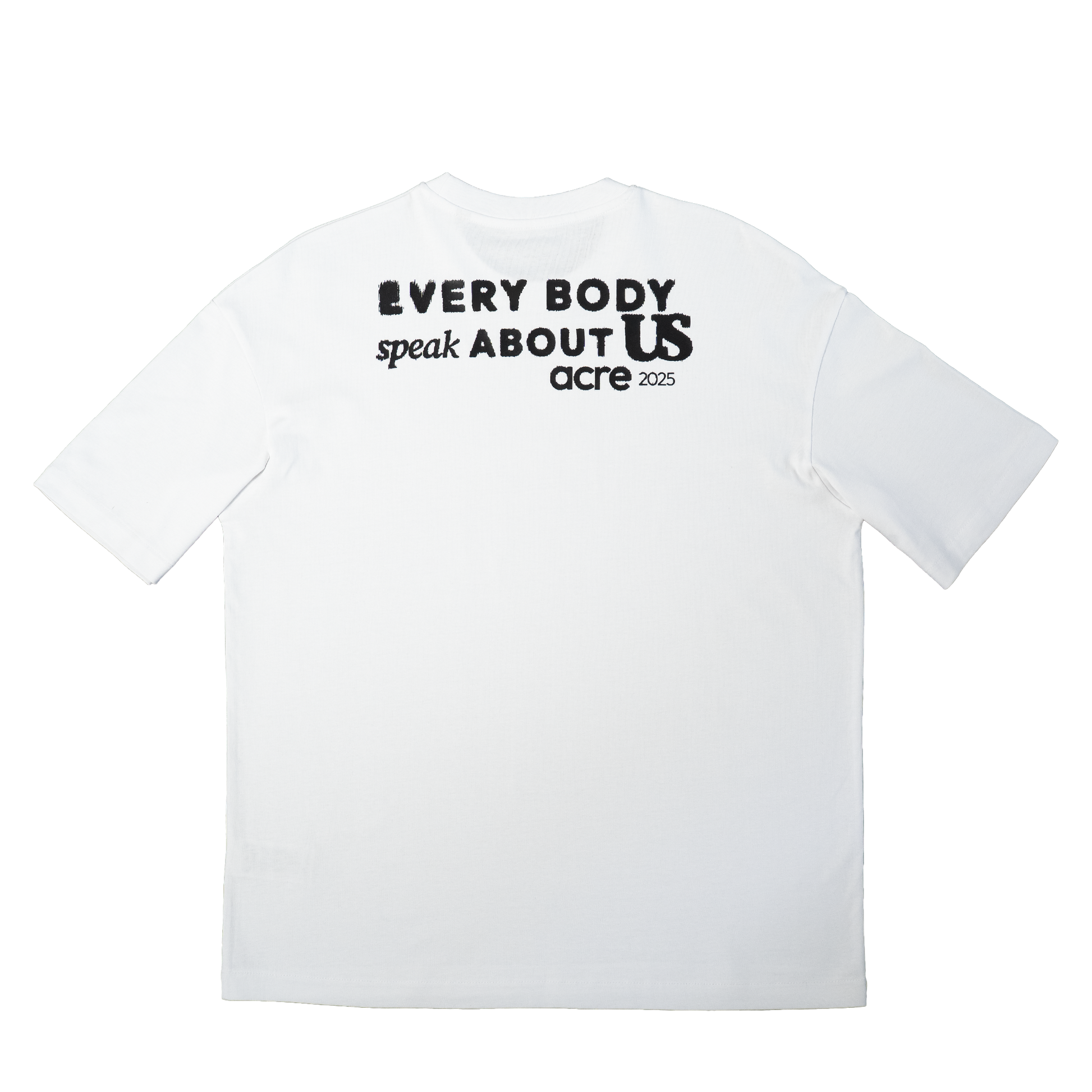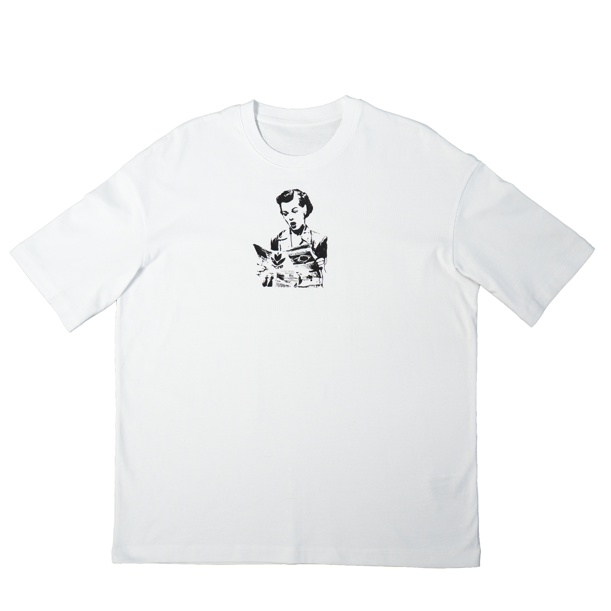 T-shirt blanc oversize en coton premium, orné d’un visuel rétro façon collage pop .